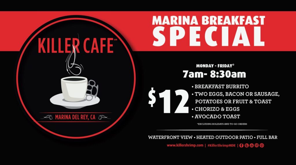 Killer Cafe is Marina del Rey’s favorite neighborhood diner, known for its amazing waterfront views is back! This classic diner experience has all of your old favorite and new items on the menu. Come enjoy the same massive booths that fit the whole family and enjoy the newly renovated patio with the same gorgeous waterfront views every day from 7AM-3PM. We’re serving our classic Killer Shrimp signature dishes as well bringing back the Killer Cafe favorites you’ve been asking us for. Over a dozen mile-high burgers and sandwiches to choose from along with our famous breakfast served all day. Check out the menu section to see all the latest mouth-watering diner specials and come see us for your next breakfast, brunch, or lunch!